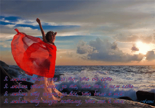 A woman in a flowing red dress stands on a rocky beach at sunset, with Russian text about life and love.