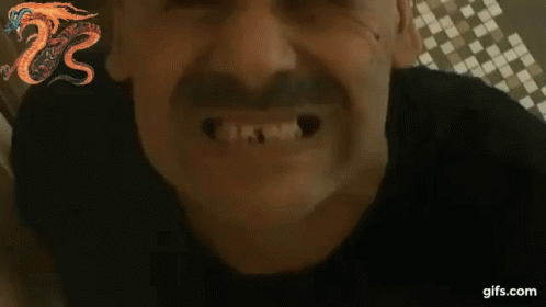 A man with a mustache and missing teeth grimaces at the camera, featuring a dragon logo.