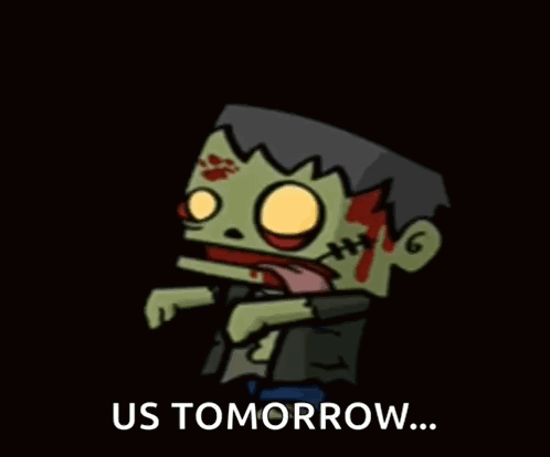 Cartoon zombie with blood and scars, with the text 'US TOMORROW...' below it.