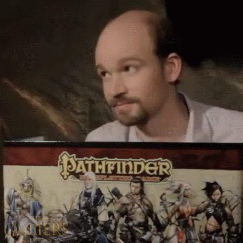 A man from Zombie Orpheus Onward smiles while looking at a Pathfinder game box.