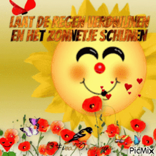 A cheerful sun surrounded by red flowers and butterflies, with a message to let the rain disappear and the sun shine.