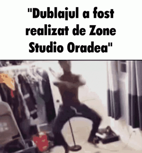 a man is standing in front of a microphone with the words " dublajul a fost realizat de zone studio oradea "