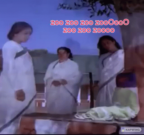 Women in white robes perform a scene with the 'Zoo Zoo So Jaa' song playing in a traditional setting.