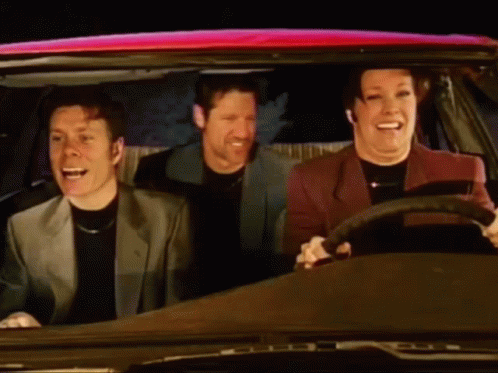 Zoran Gvojic and two others laughing in a car, part of Lowcarbcomedy Dead Meat Kill Count.