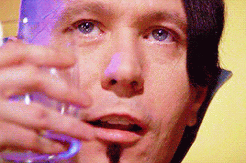 Jean-Baptiste Emanuel Zorg from The Fifth Element takes a drink from a glass with a peculiar expression.