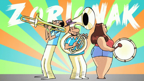 A cartoon band named Zorionak playing a trombone, tuba, and drum against a colorful background.