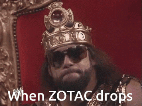 Macho Man Randy Savage meme with the text 'When ZOTAC drops' displayed, showing a reaction.