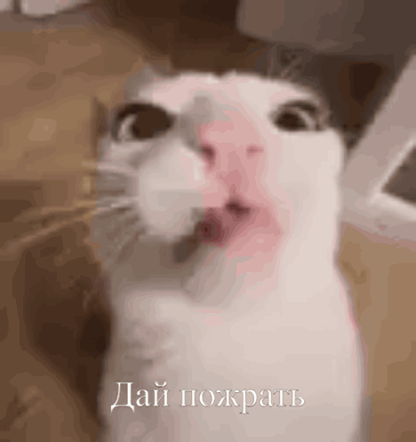 White cat with a pink nose and open mouth, looking up and asking for food, with Russian text "Дай пожрать" visible.