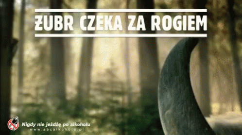 Polish Żubr beer advertisement featuring a majestic bison in a forest, with the slogan 'Żubr Czeka Za Rogiem' and a responsible drinking message.