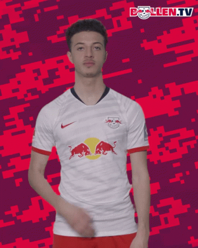 Ethan Ampadu performs a shoulder dusting gesture while wearing his RB Leipzig jersey.