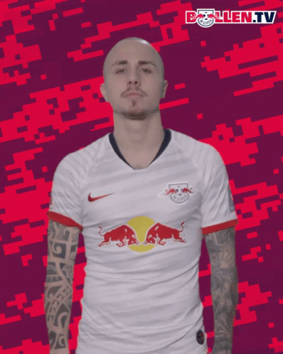 Angelino, the RB Leipzig player, performs a confident shoulder dusting gesture, showing his easy, no-effort style.