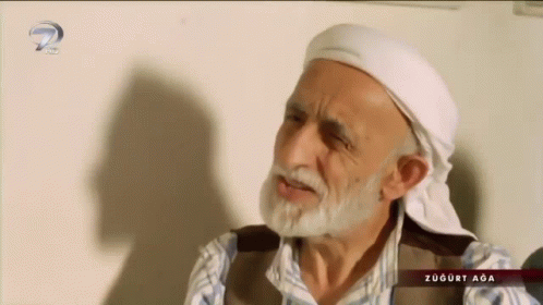 Züğürt Ağa, a man with a beard and head scarf, is seen talking and gesturing on a TV screen.
