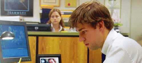Jim Halpert in the office struggles with boredom and sleepiness at his desk, with Pam Beesly in the background.