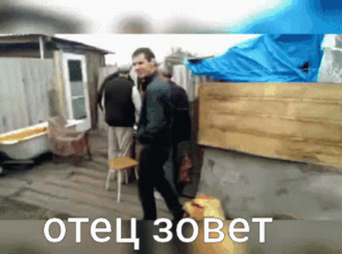 Lekha Zhunkovsky, with a backpack, is called by his father in a rural backyard setting.