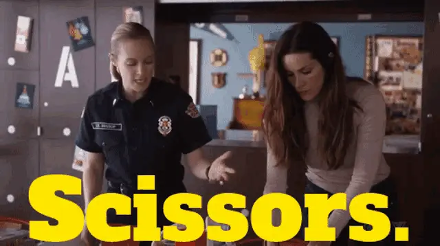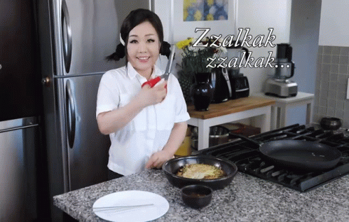 Emily Kim smiles while cutting food with scissors in her kitchen, making a 'Zzalkak Zzalkak' sound.