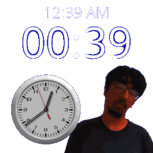 a man stands in front of a wall clock that says 12:39 am