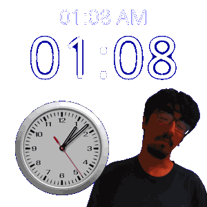 a man stands in front of a clock that says 01.08 am on it