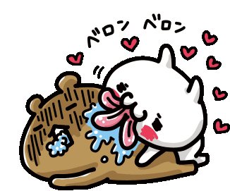 A cute white creature, 舔02, enthusiastically licks a distressed brown bear, surrounded by floating hearts.