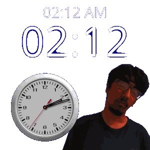 a man with glasses stands next to a clock that says 02:12 am