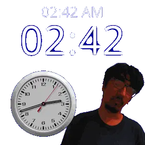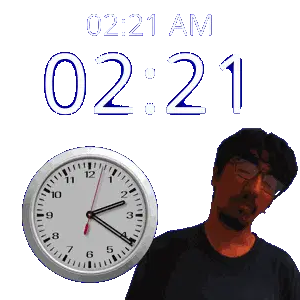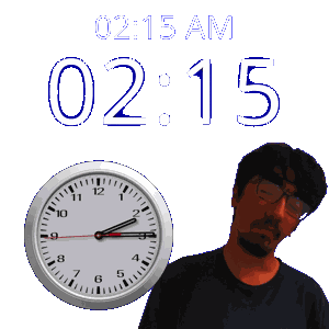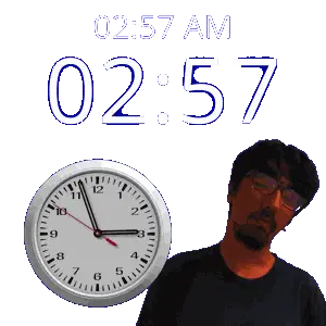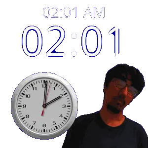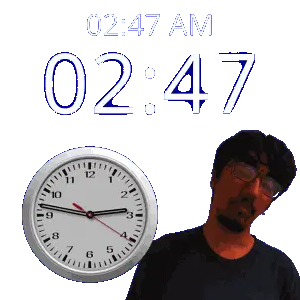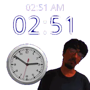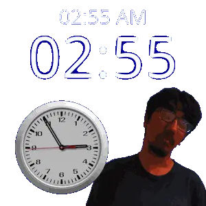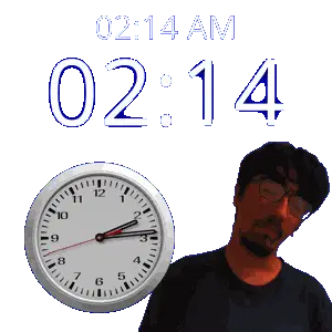 a man stands in front of a wall clock that says 02:15 am