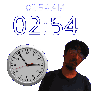 a man stands in front of a wall clock that says 02:54 am