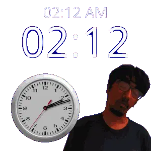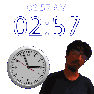 a man with glasses stands next to a clock that says 02:57 am