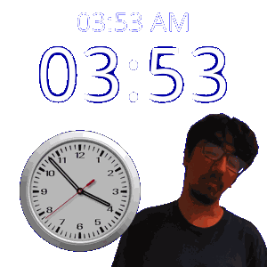 a man stands in front of a wall clock that says 03:53 am