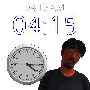 a man stands in front of a clock that says 4:15 am
