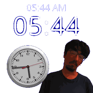 a man is standing in front of a clock that says 05:44 am