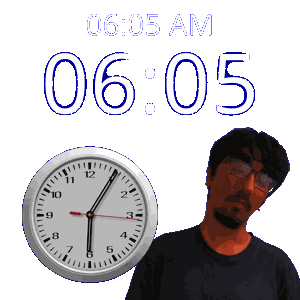 a man with glasses stands next to a clock that says 6:05 am