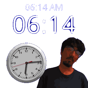a man stands in front of a clock that reads 6:14