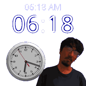a man stands next to a clock that says 6:18 am
