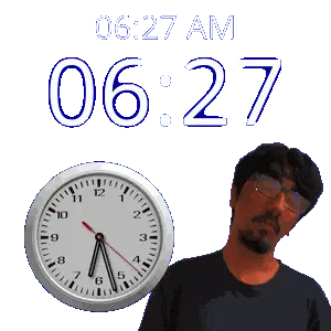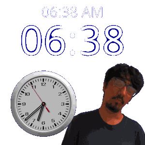 a man with glasses stands next to a clock that says 06:38 am