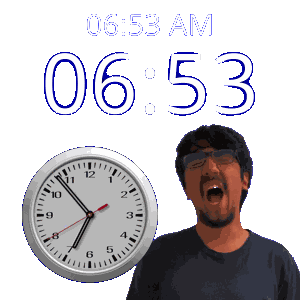 a man stands in front of a clock that says 6:53 am on it