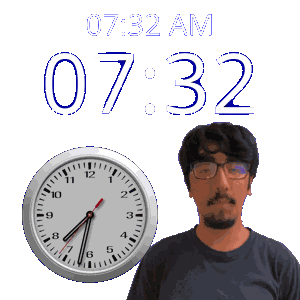 a man wearing glasses stands in front of a clock that says 07:22 am