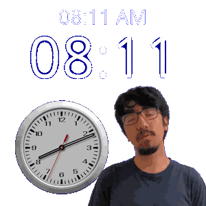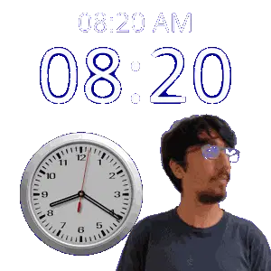 a man wearing glasses stands in front of a clock that says 8:11 am