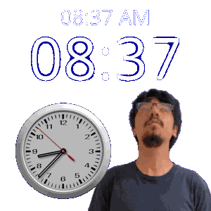 a man with glasses stands next to a clock that says 18:37 am