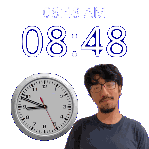 a man with glasses stands in front of a wall clock that says 8:48 am