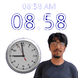 a man with glasses stands in front of a clock that says 8:58 am