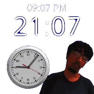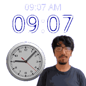 a man wearing glasses stands in front of a clock that says 9:07 am