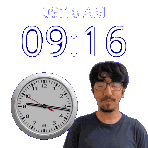 a man with glasses stands in front of a wall clock that says 9:16 am