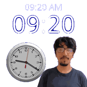 a man wearing glasses stands in front of a clock that reads 9:20 am