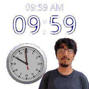 a man with glasses stands next to a clock that says 09 59 am