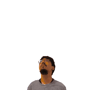 a man with a beard and glasses looks up at the number 28