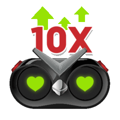 A black robot-like object with glowing green hearts and '97X' with upward arrows, signifying a big increase.