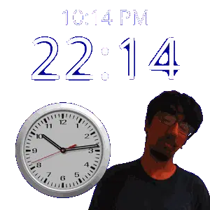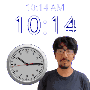 a man wearing glasses stands next to a clock that says 10:14 am