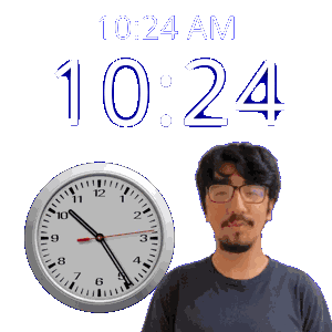 a man with glasses stands in front of a clock that says 10:24 am