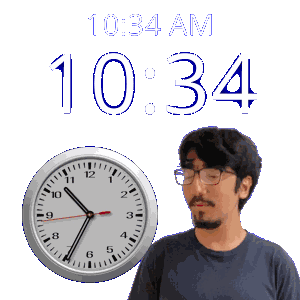 a man stands in front of a wall clock that says 1034 am