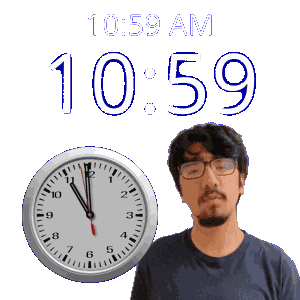 a man wearing glasses stands next to a clock that says 10:59 am