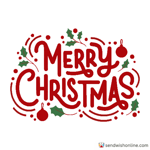 Animated 'Merry Christmas' text with festive holly, berries, and ornaments, changing colors.